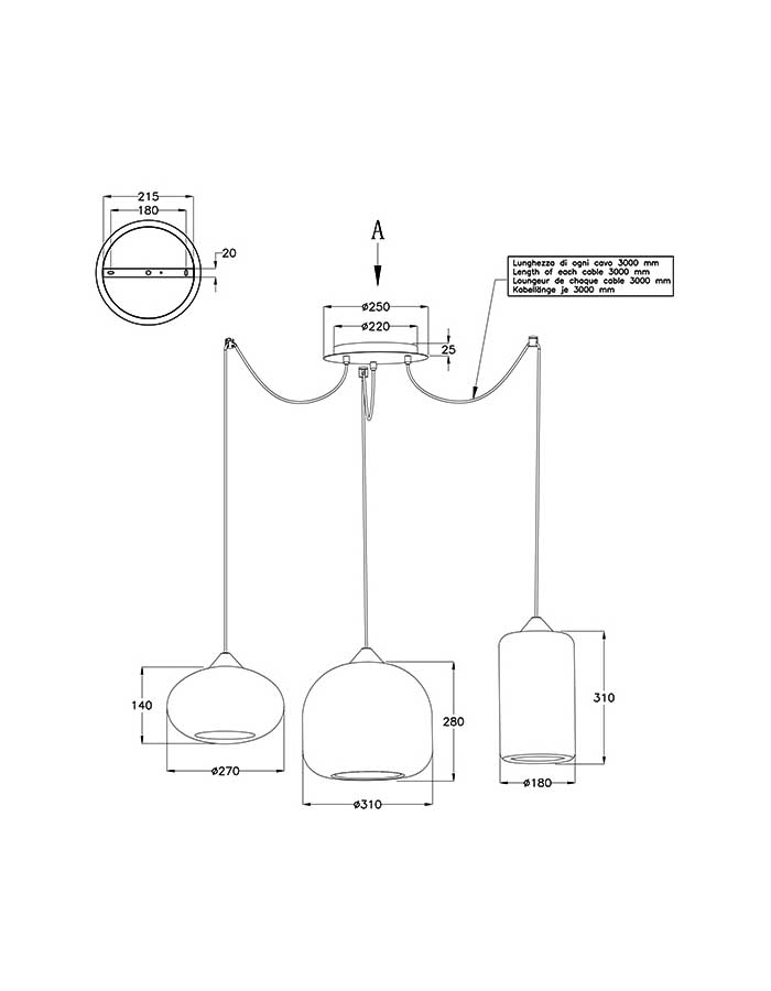 L’altezza è regolabile fino a 200 cm, permettendo di adattare facilmente la lampada a soffitti alti o composizioni scenografiche sopra tavoli da pranzo e isole cucina.