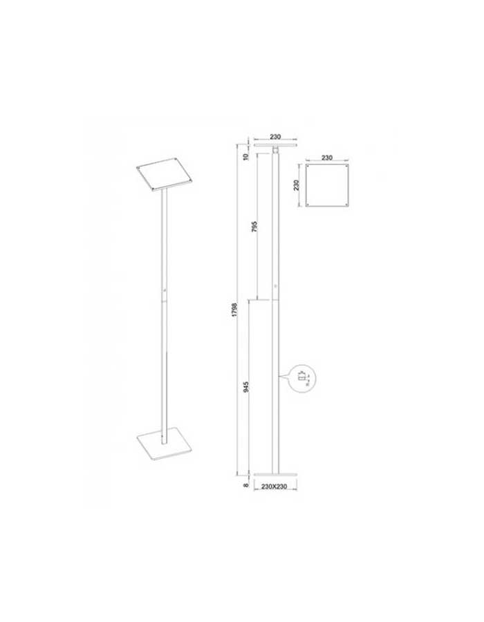 Una struttura in acciaio per la base e l’asta, che le dona stabilità e durabilità, e un diffusore quadrato in metacrilato.