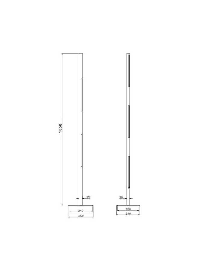 Da essa si innalza un corpo illuminante sottile e verticale, che culmina in un elemento luminoso integrato, incastonato in una cornice metallica.