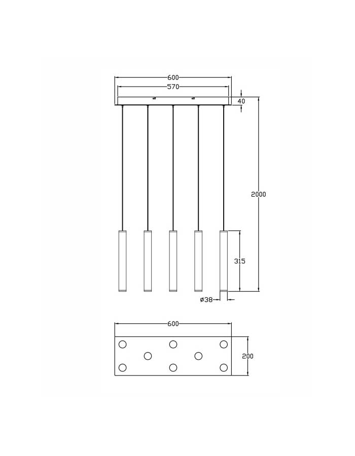 La sua struttura è composta da una base rotonda in metallo (Ø40 cm), da cui pendono cinque eleganti elementi cilindrici.