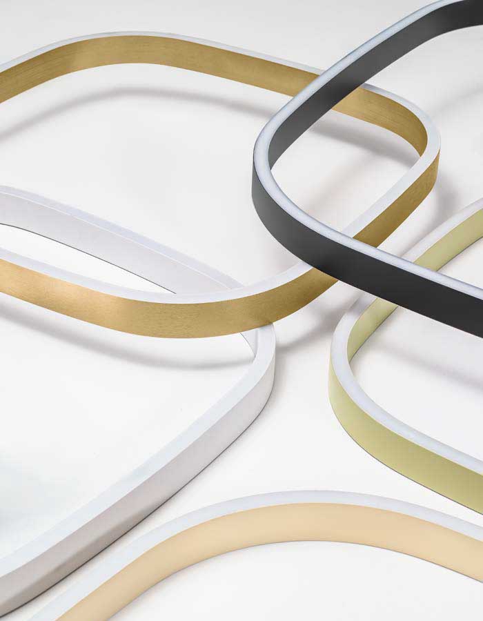 La sua struttura è realizzata in alluminio, disponibile in finiture di pregio come il bianco opaco, nero opaco o l’oro satinato e i nuovi beige e salvia.