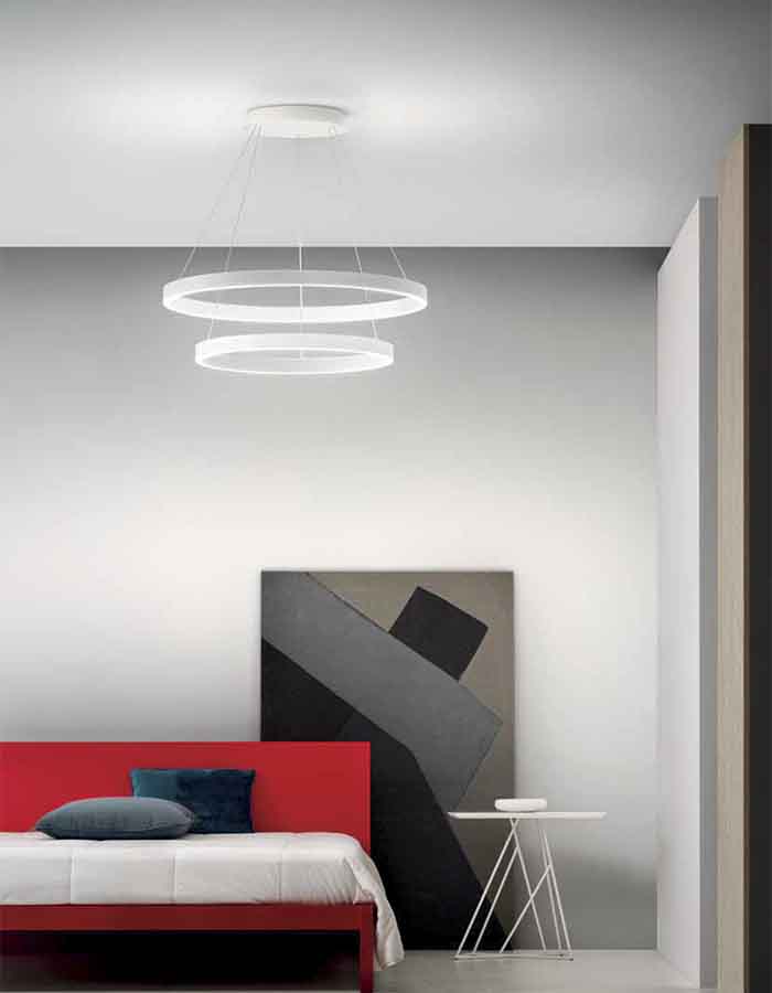 Si distingue per il suo design minimalista e moderno, incentrato su un unico anello luminoso che fluttua elegantemente nell’ambiente.