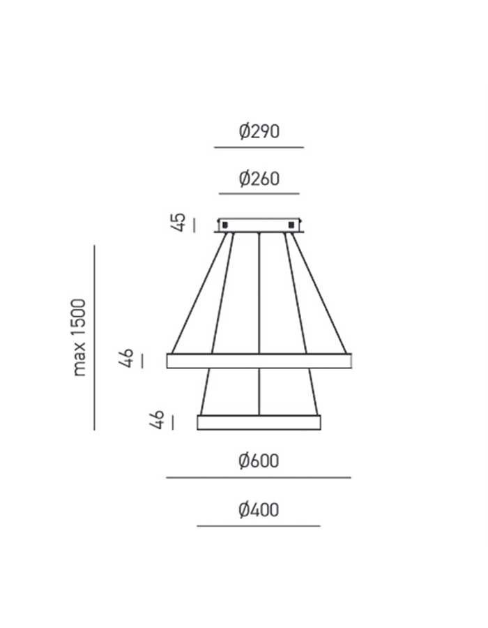 Si distingue per il suo design minimalista e moderno, incentrato su due anelli luminosi perfetti (Ø60 cm e Ø40 cm) che si sovrappongono o si affiancano in una composizione armoniosa.