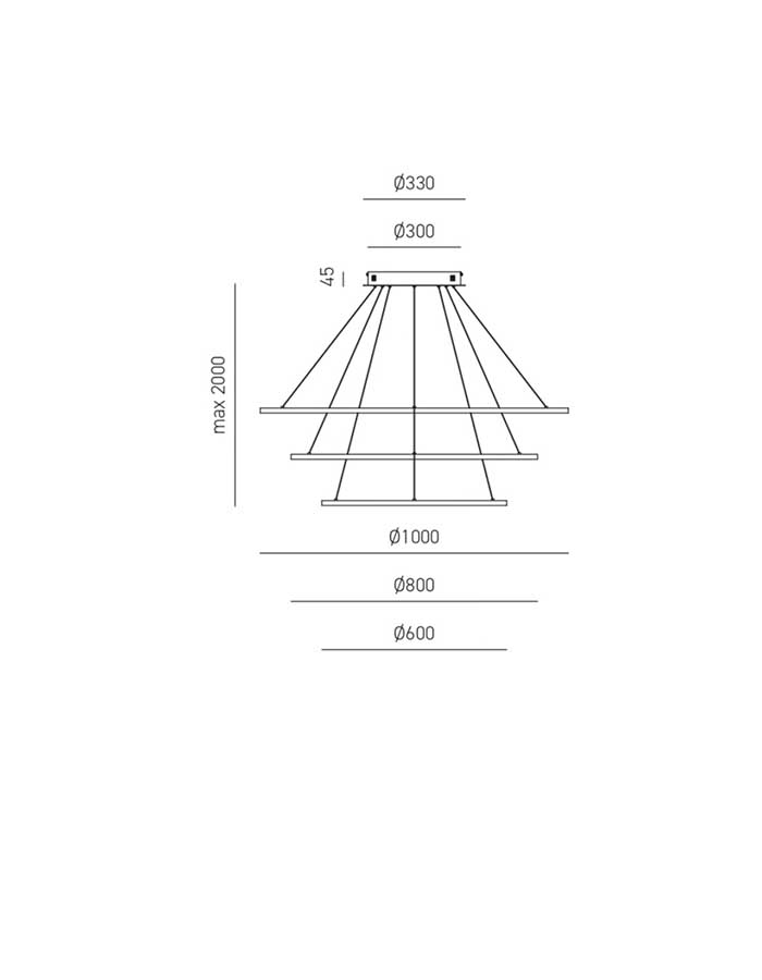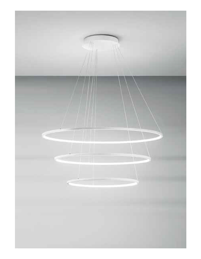 Si distingue per il suo design moderno e minimalista, caratterizzato da due anelli luminosi di generose dimensioni (Ø100 + 80 + 60 cm) sospesi in modo armonioso.