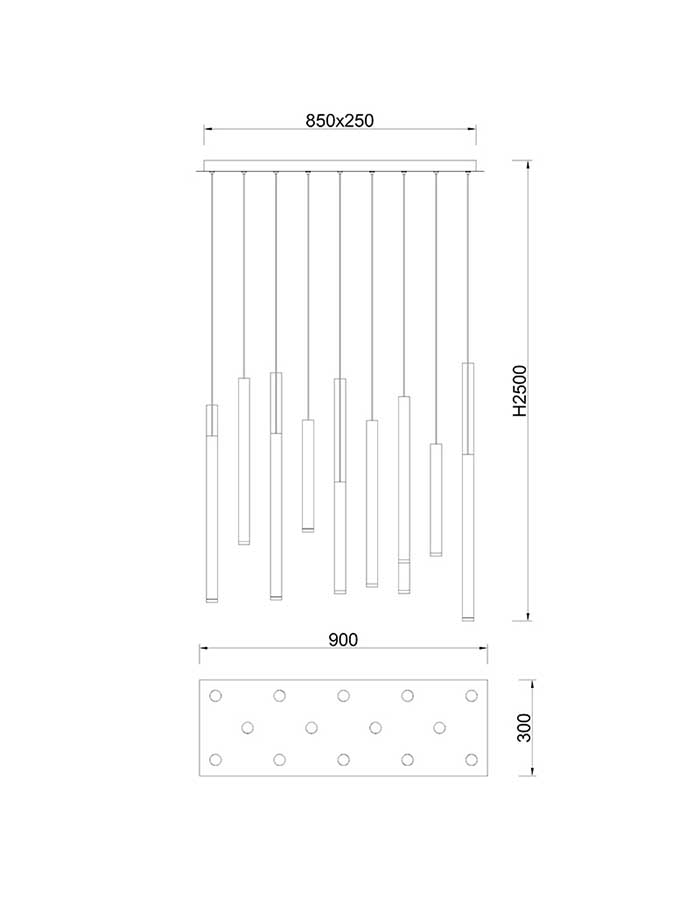 È dotata di una base rettangolare in metallo nero da cui pendono 8 o 14 pendenti tubolari a LED, di colore multicolore (oro, marrone, nero).