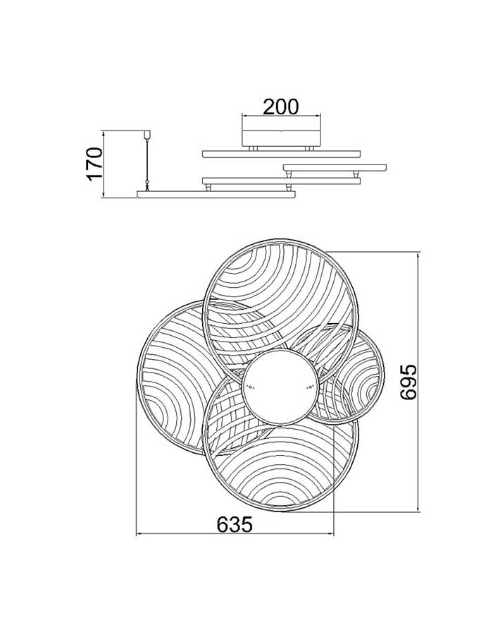 La plafoniera si compone di quattro elementi circolari che si sovrappongono o si affiancano in un “collage” geometrico.