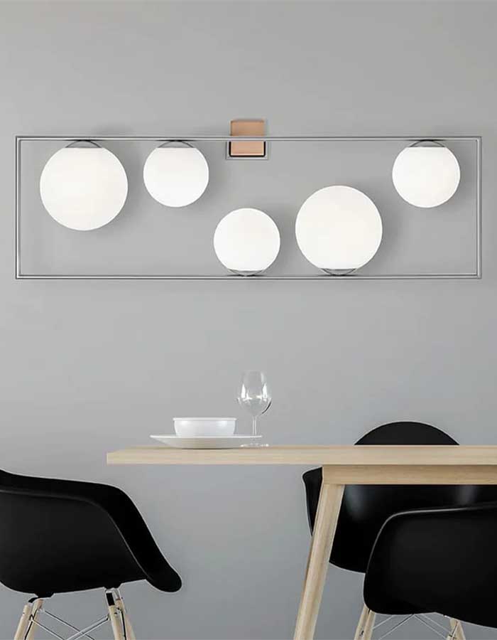 Il suo design unico, con le cinque sfere di vetro di diverse dimensioni, crea un gioco armonico di asimmetrie e proporzioni, aggiungendo un tocco di eleganza e luminosità.