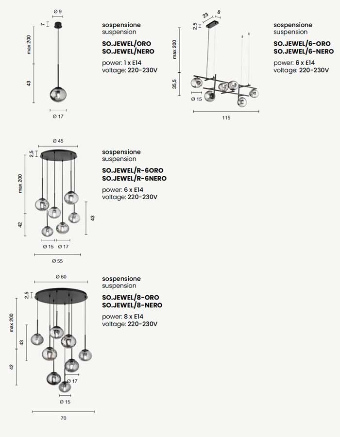 L’apparecchio monta 6 portalampade E14, lasciando a te la libertà di scegliere il tipo di lampadina più adatto.