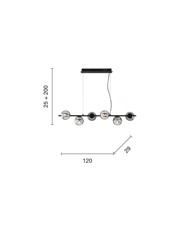 Il design distintivo della Monile Sospensione si basa su una struttura lineare a binario in metallo , robusta e minimalista, da cui pendono sei delicate sfere in vetro soffiato .