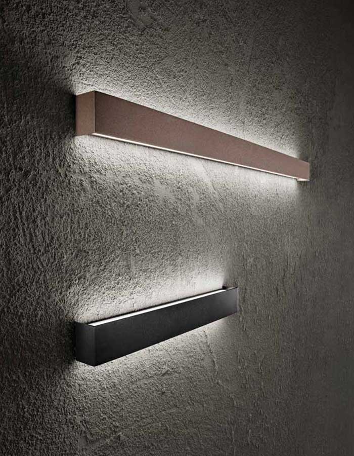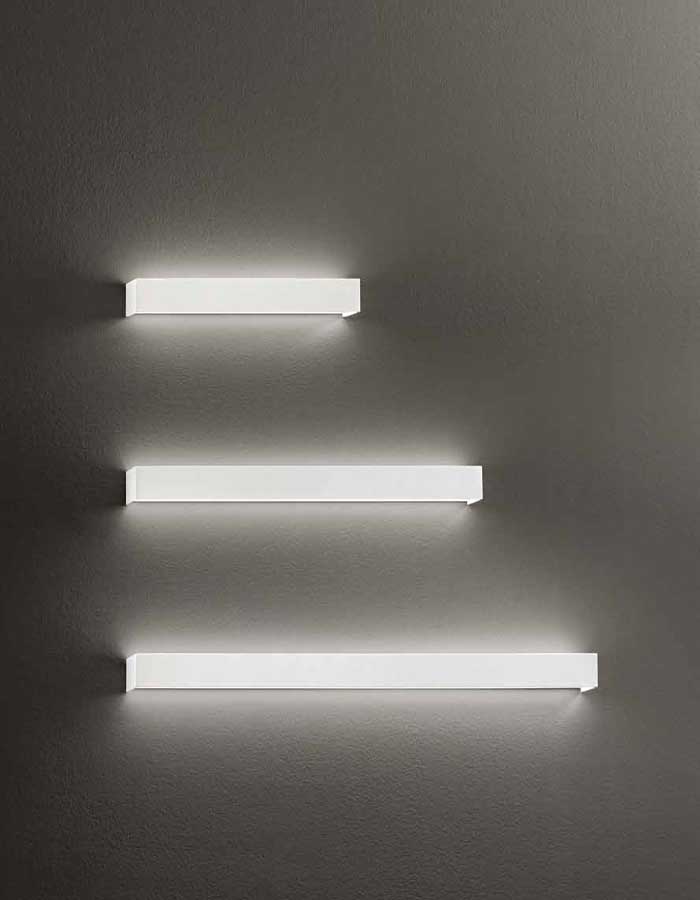 Con uno spessore di soli 3,5 cm e un’altezza di 5 cm, Rummo è progettata per “scomparire” sulla parete quando spenta e trasformarsi in una lama di luce scenografica quando accesa.