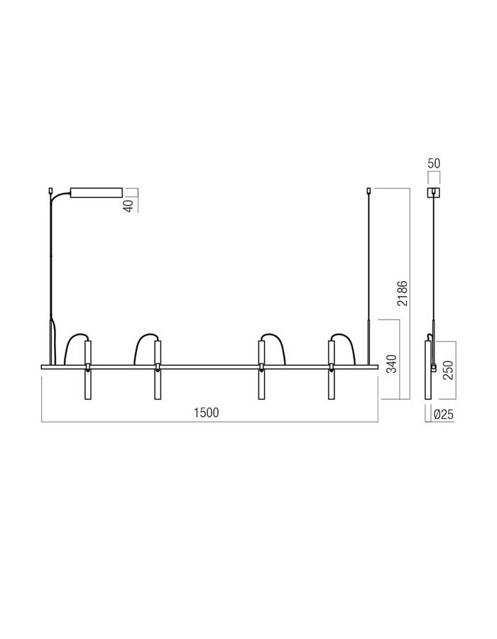Redo Praxi Sospensione 4 faretti Led è composta da una barra lineare e cavi regolabili che sostengono i quattro spot.