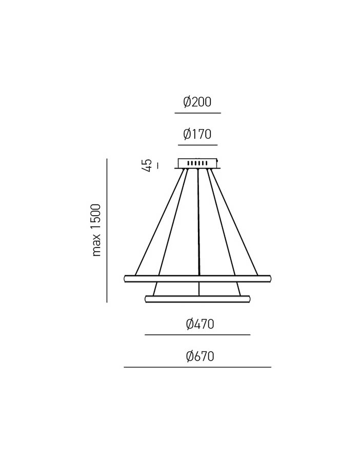 Questa sospensione si distingue per il suo design a doppio anello, con diametri di 47 cm e 67 cm, che creano un gioco visivo armonioso e scenografico.
