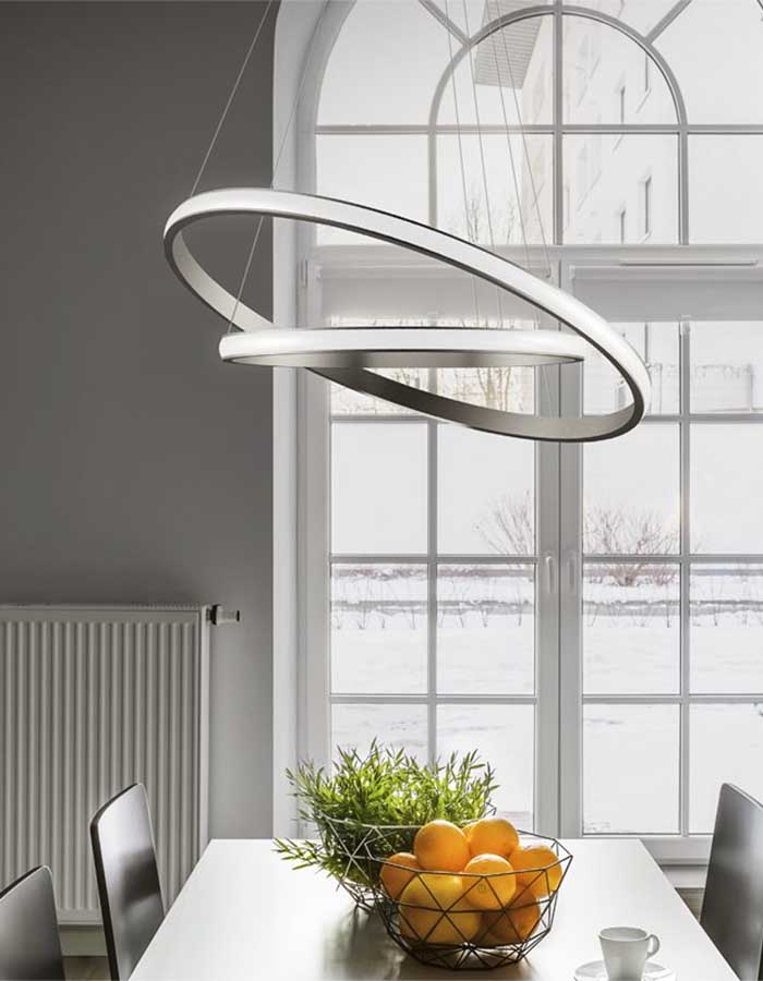 Perfetto per valorizzare ambienti open space, tavoli da pranzo, penisole, soggiorni e ambienti contract come sale meeting, ristoranti o hall di hotel.
