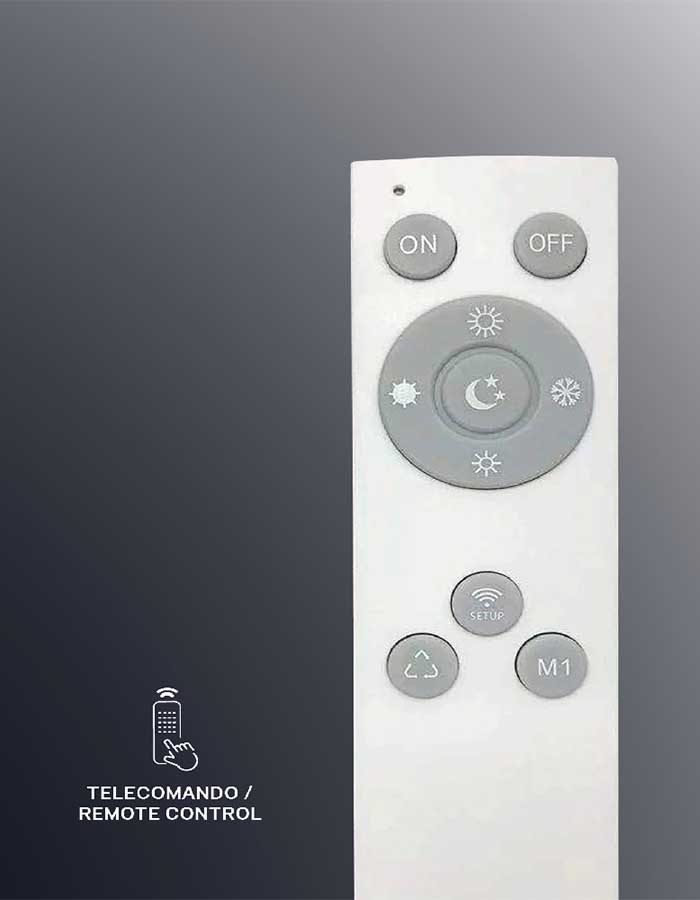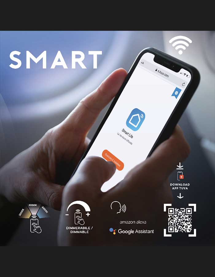 Plafoniera smart che permette di regolare colore ed intensità della luce, programmabile e controllabile sia da remoto che tramite l’apposito telecomando dato in dotazione.
