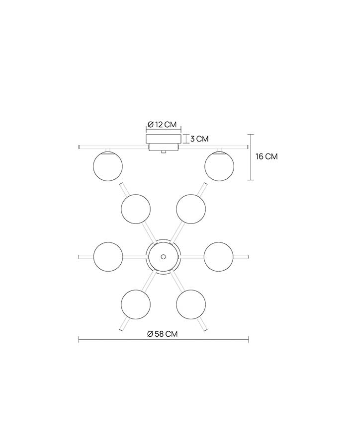 La sua struttura circolare in metallo sostiene sei sfere in vetro, garantendo una distribuzione della luce equilibrata e completa.